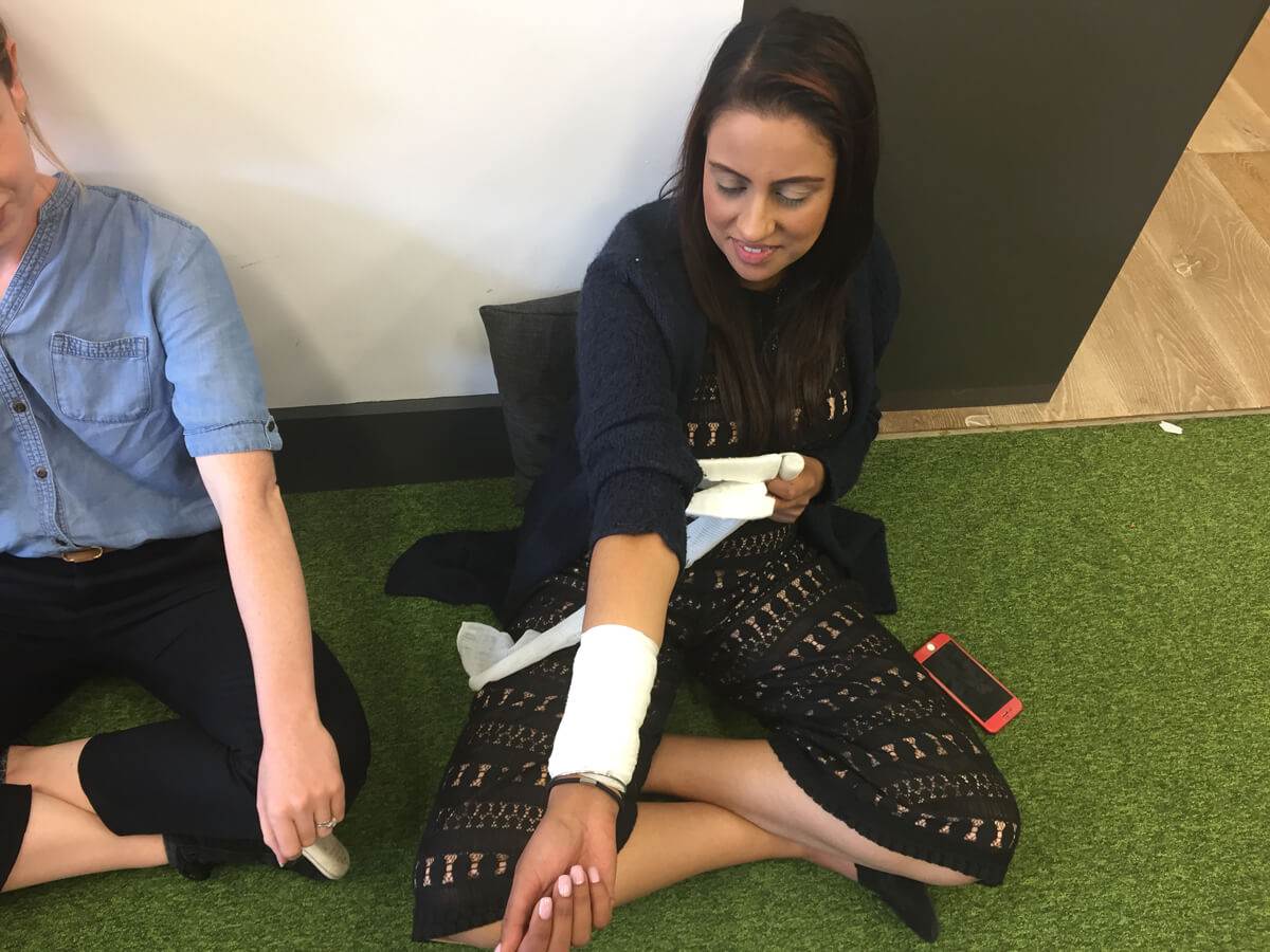 Bandaging practiceSome good bandaging being done here as well as all the practical things that can be done for someone if they obtain an injury our delegates have learnt that what is just as important is talking to the patient and providing them with reassurance this simple thing can help prevent a situation from worsening by calming the patient down. -