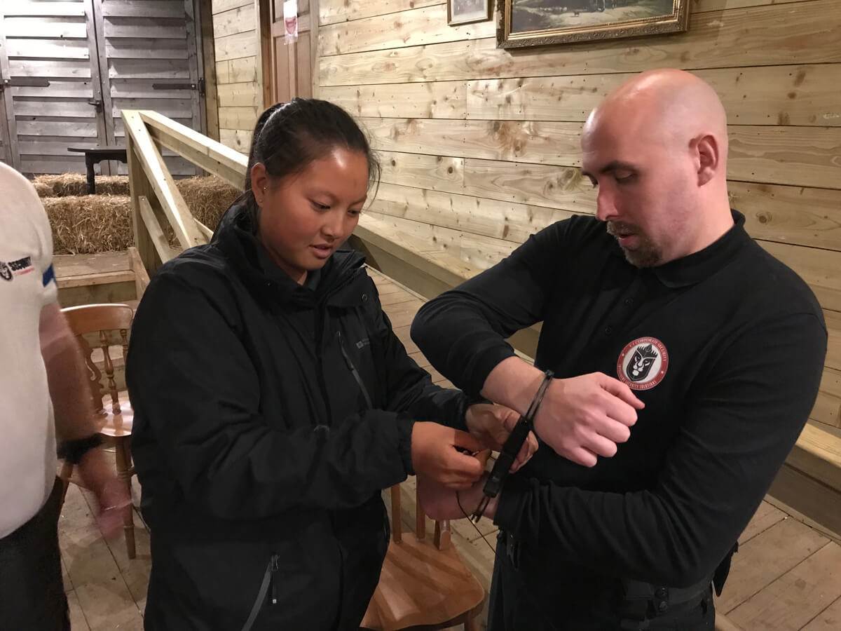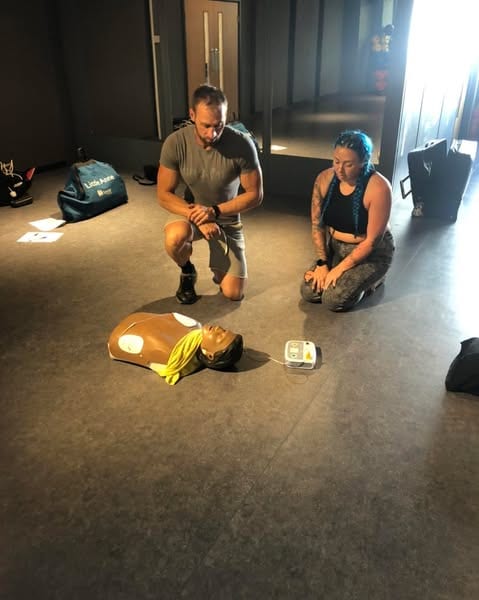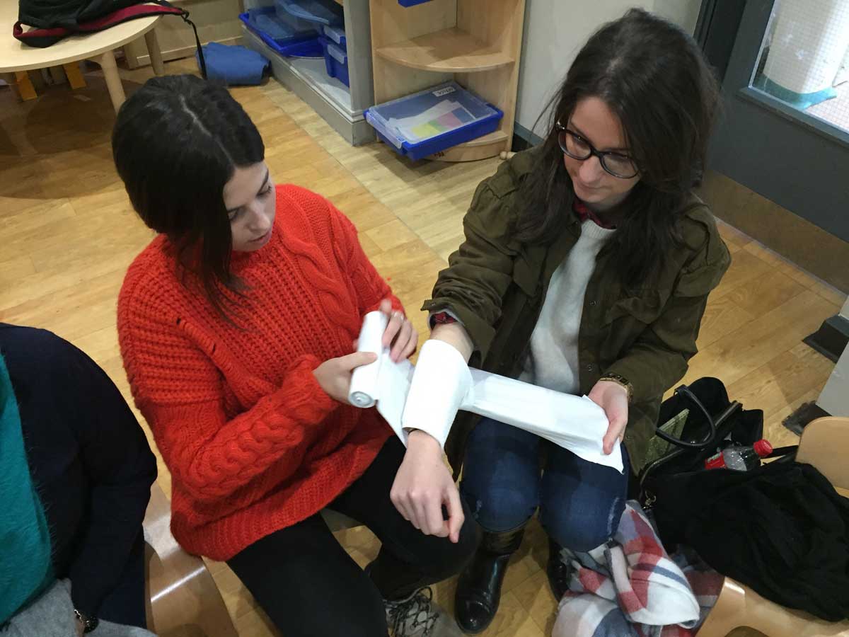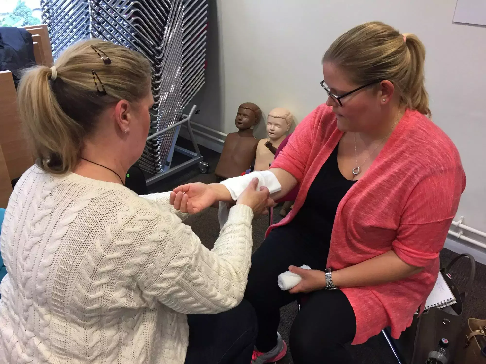 EFAW courses practiceHere we have a learner on one of EFAW courses practising applying a bandage to another learner this is after learning what type of wounds we can suffer and the importance of recognising the symptoms of shock and the things we can do for someone should they suffer the effects -